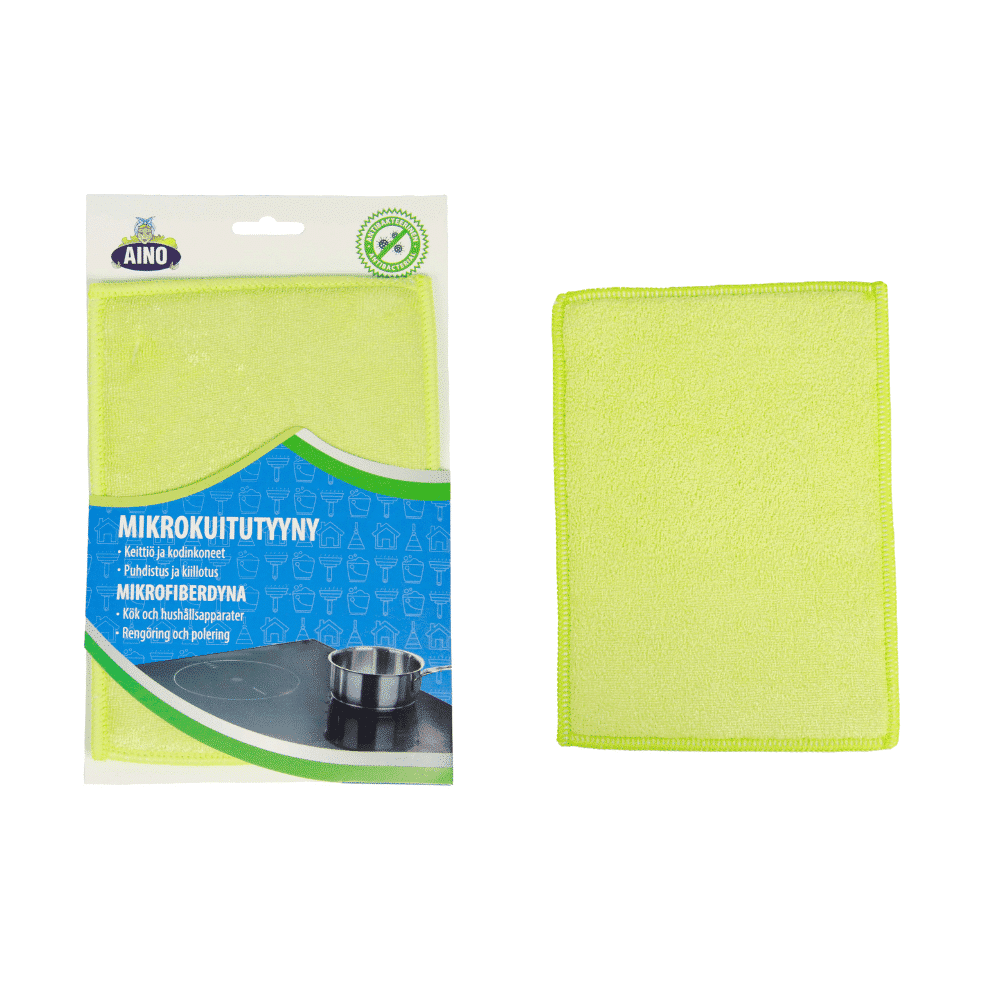 Aino mikrokuituinen sieniliina soveltuu erityisesti keittiön pintojen ja kodinkoneiden puhdistukseen ja kiillotukseen. Tiheästä mikrokuidusta valmistettu imukykyinen tyyny puhdistaa lian ja tahrat pelkän veden avulla. Liina jättää puhtaan ja kiiltävän lopputuloksen ilman voimakkaita pesuaineita.