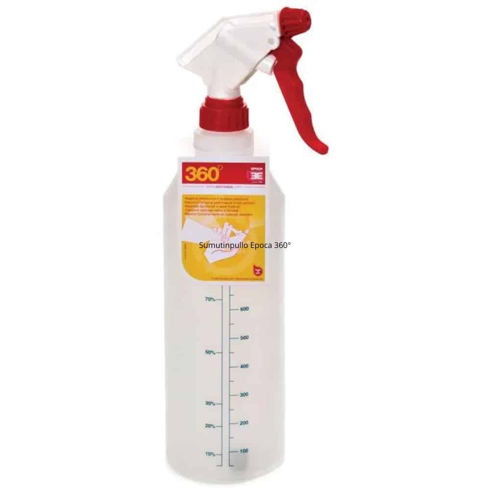 Sumutinpullo Epoca 360° 1L – Kätevänkokoinen yhden litran sumutinpullo mm. pesuaineita varten. Pulloa voi käyttää ylösalaisin. Pullon kyljessä on mittaasteikko joka kertoo sisällön määrän millilitroina tai prosenttimääränä. Sumutinpullossa on säädettävä suutin, jolla saa pistemäisen suihkun.