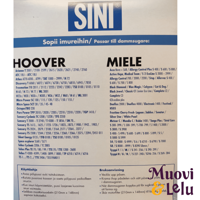 Mikrokuidusta valmistettu imurin pölypussi tarjoaa parhaan suodatuksen kotipölyn imuroinnissa. Mikrokuitupölypussin nelinkertainen rakenne tarjoaa sinulle 5 x tehokkaamman suodatuksen kuin paperipölypussi. Pakkaus sisältää viisi pölypussia sekä moottorisuodattimen.