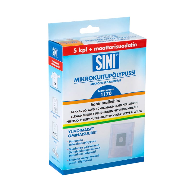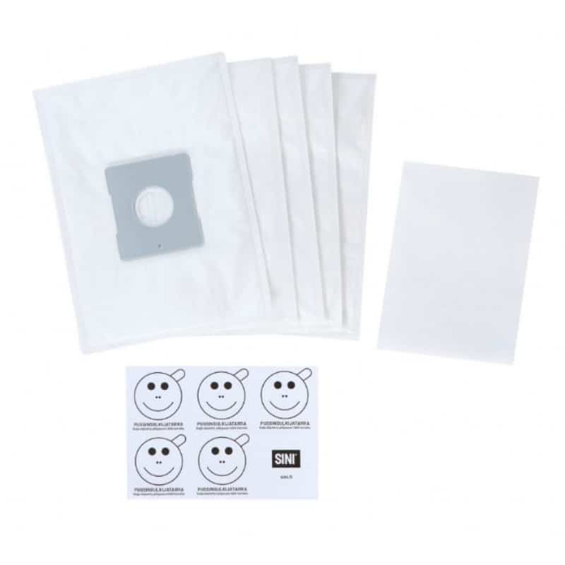 Pakkaus sisältää viisi pölypussia ja moottorisuodattimen.