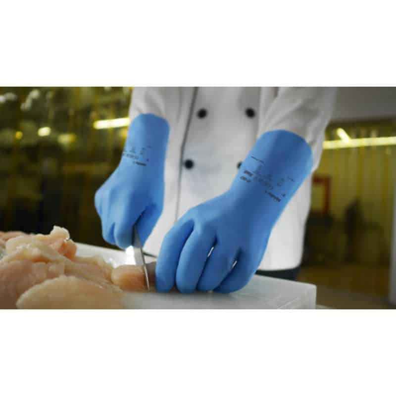 Korkea mukavuus yhdistettynä hyvään kemikaalien ja mekaaniseen suojaukseen. Sopii kosketukseen elintarvikkeiden kanssa. Kloorattu parempaa käsiteltävien tuotteiden suojausta varten. Helppo pukea ja riisua. Nukkavuorinen käsine sataprosenttista puuvillaa. Erinomainen kohotettu pitokuvio turvalliseen käsittelyyn. Erittäin hyvä kestävyys monia liuottimia ja öljypohjaisia kemikaaleja vastaan. Joustava, erinomainen kätevyys.