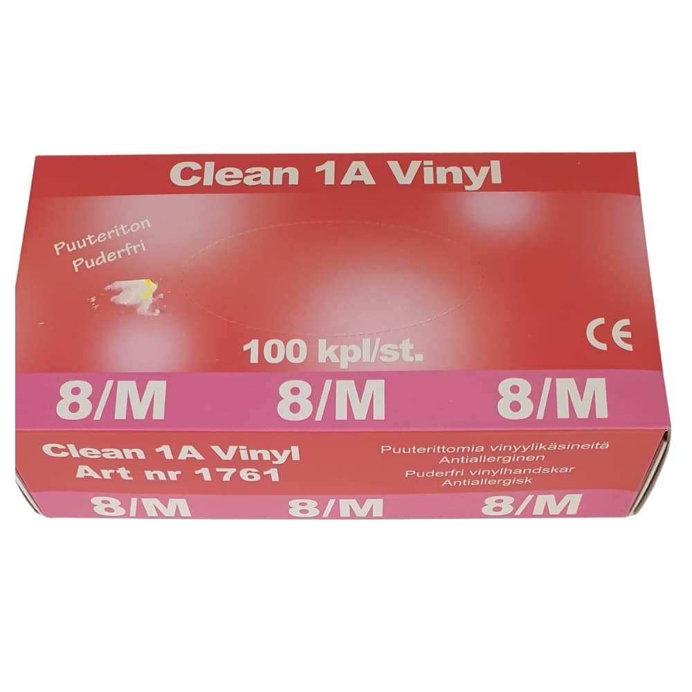 Vinyylikäsine 8/M-koko 100 kpl – Puuteriton vinyylikäsine. Valmistettu Vahvasta materiaalista, joka kestää teollisuuskäyttöä. Pakkaus: 100kpl/rasia.
