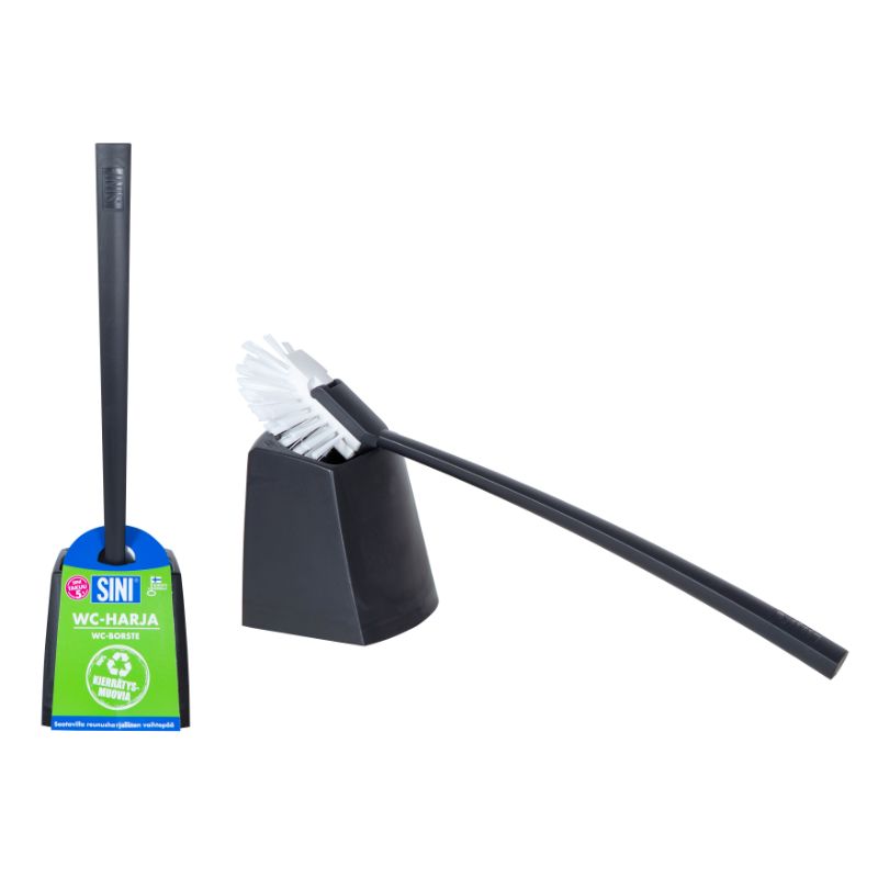 Kapeanmallinen wc-harja. Yksipuolisen harjastuksen vuoksi harja ylettyy syvemmälle kuin tavanomainen pyöreä WC-harja. Harjassa on myös raaputusreuna. Harjaa on hyvä säilyttää sen omassa tukevassa telineessä WC-istuimen vieressä. Wc-harjan varsi, harjapää ja kuppiosa on valmistettu 100 % kierrätysmuovista. Kierrätysmuovista valmistettu wc-harja on yhtä kestävä ja laadukas kuin neitseellisestä muovista valmistettu.