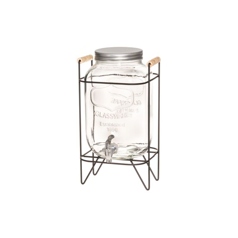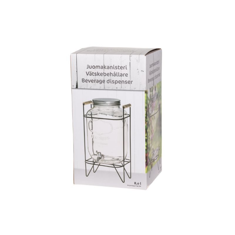 Lasinen tyylikäs 8 litran juomakanisteri kätevässä kahvallisessa telineessä. Juomakanisterissa on hana ja kierrettävä kansi.