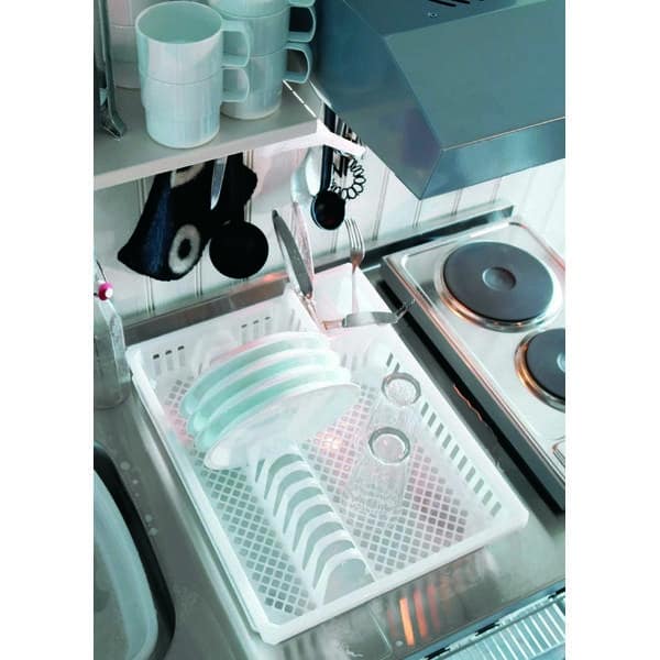 Valutustelineeseen mahtuu isompikin määrä puhdasta tiskiä kerrallaan. Loistava tuote niin sinne missä tiskataan käsinkin kuin lisäkuivaustilaksi kotiin. Tuotteessa reilusti tilaa lautasille ja erillinen teline ateriamille.