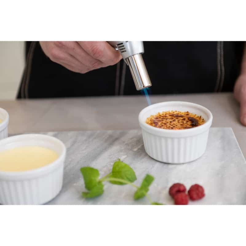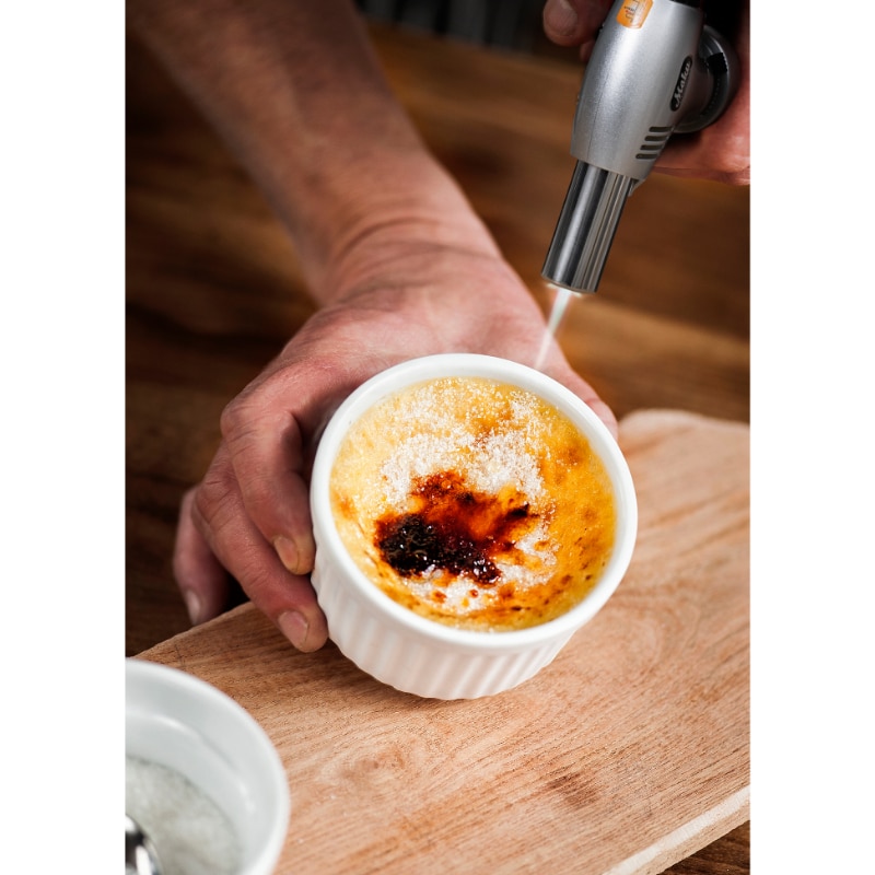Kaasupoltin creme brulee maku Kaasupoltin annosten viimeistelyyn. Polttimessa on piezosytytin ja säädettävä liekin koko. Max. lämpötila jopa 1300 astetta. Poltin myydään tyhjänä ilman kaasua. Sytyttimeen käy butaanikaasu. Puhdistus vain pyyhkimällä, ei vesipesua. Ei lasten ulottuville.