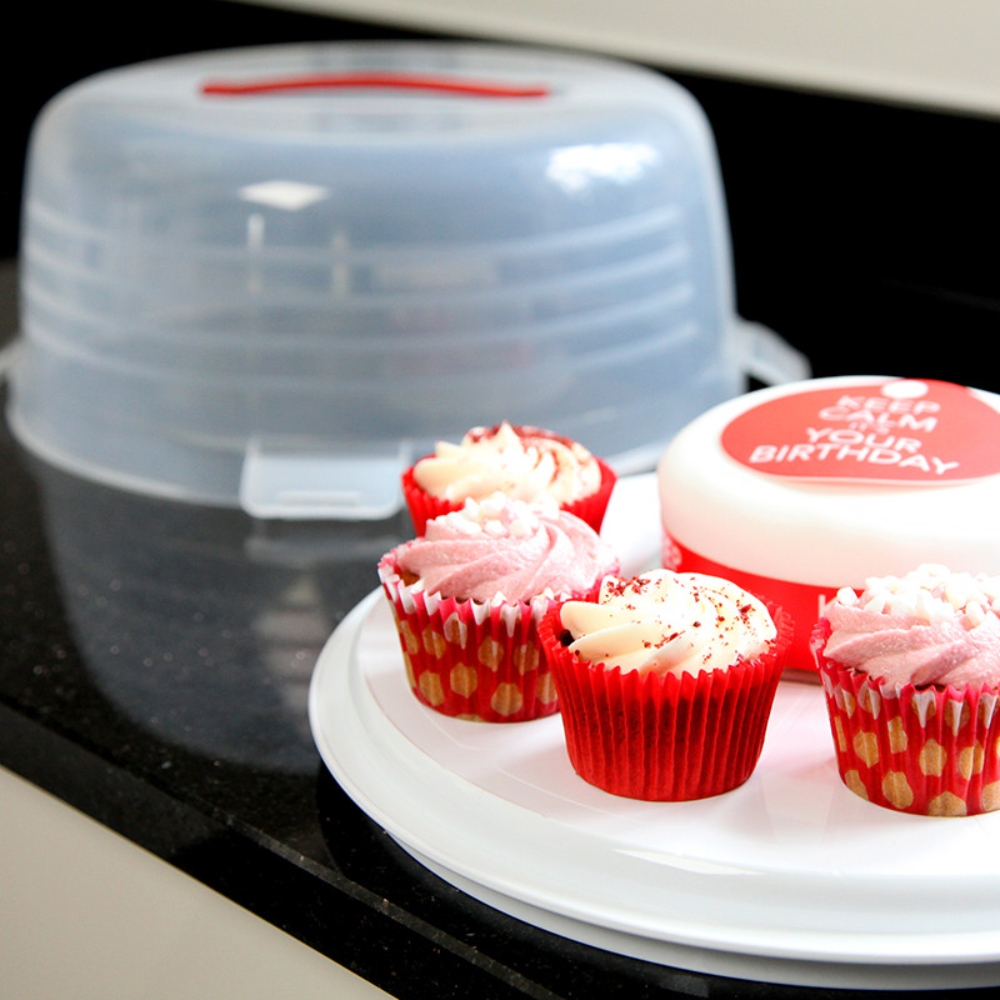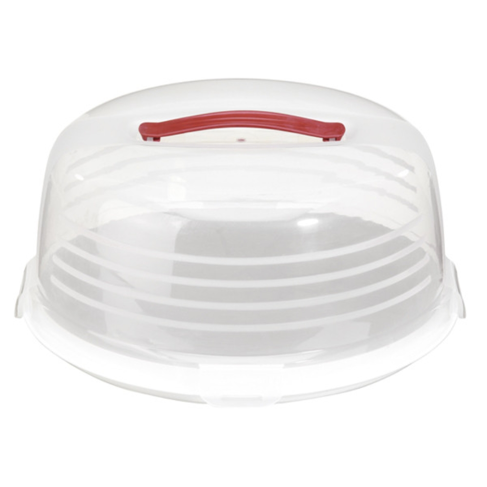 Curverin pyöreä kakkukupu sopii pyöreiden täytekakkujen säilytykseen ja kuljettamiseen. Kakkukuvussa on luonnonvalkoinen pohja, läpikuultava kupu ja punainen kahva.