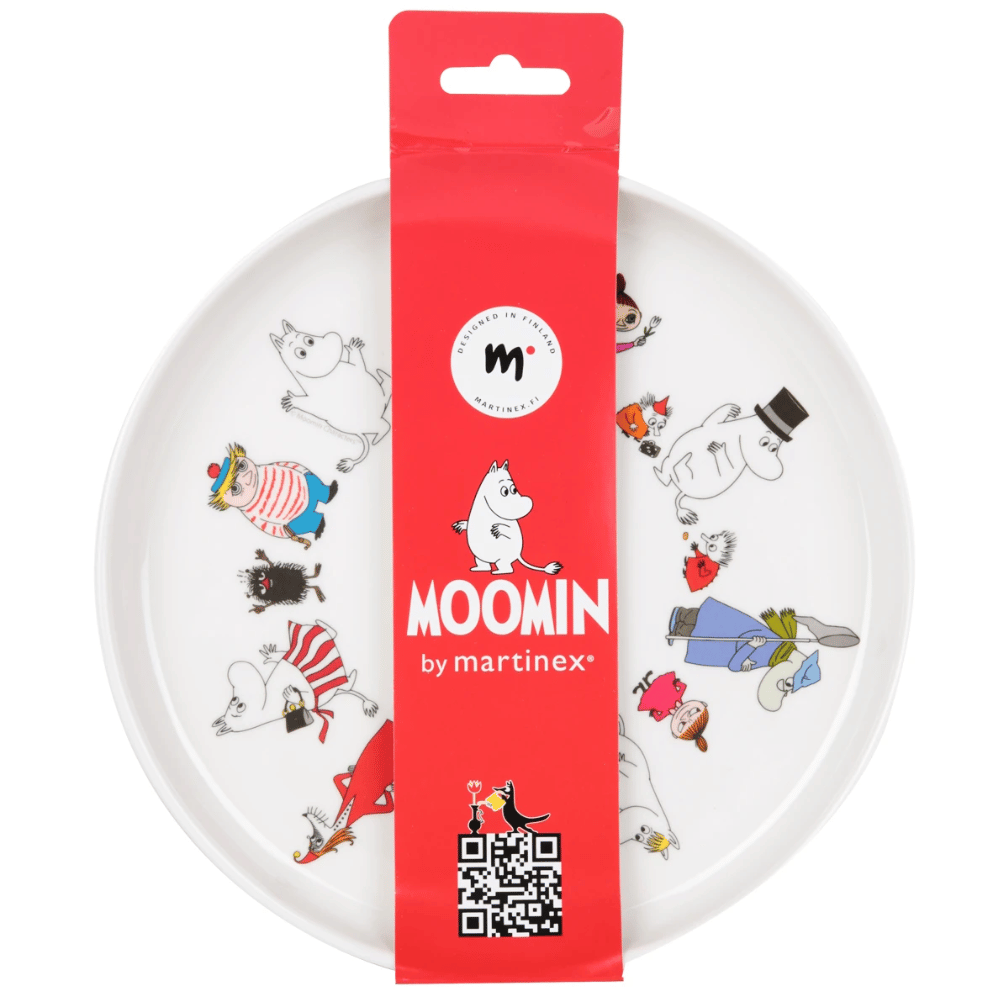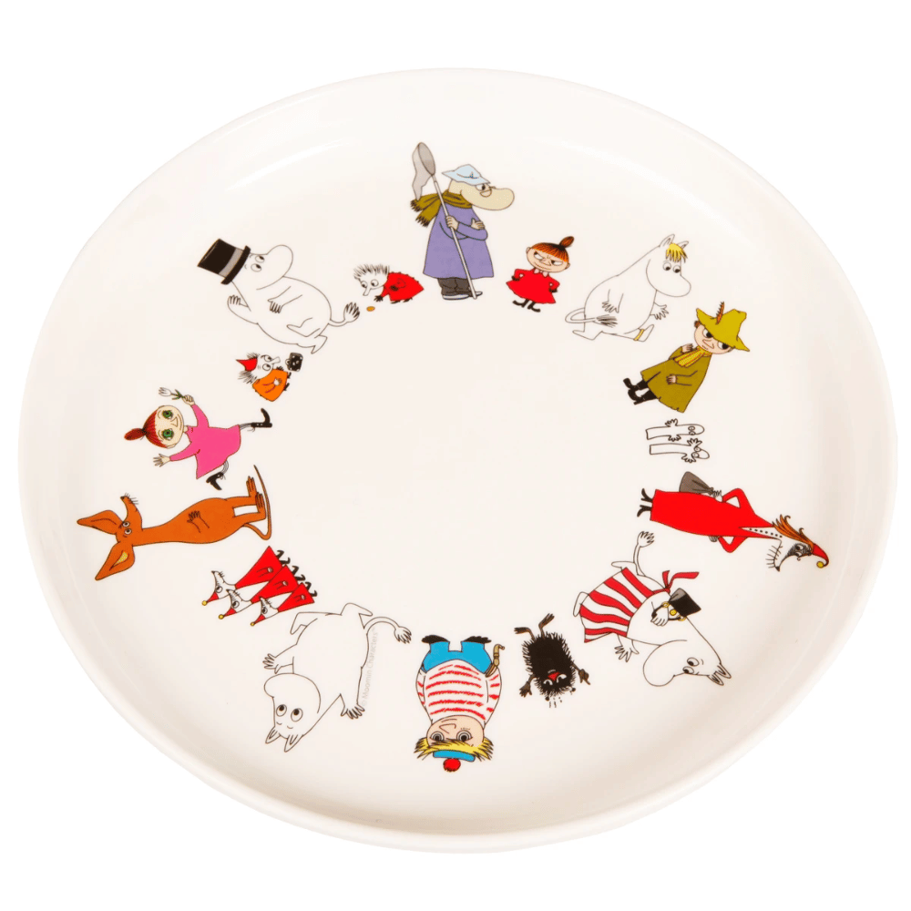 Raikkaan valkoinen lautanen matala Muumi -hahmot melamiinilautanen, jonka halkaisija on 20 cm. Lautasen reunat kohoavat hieman ylöspäin, joten siitä on helppo syödä ja saada itse ruokaa lusikkaan. Lautasen pohja on kuvitettu värikkäillä Muumilaakson hahmoilla, jotka tervehtivät pientä ruokailijaa iloisesti. Lautasen saa yhdistettyä kauniisti muihin Muumi Hahmot-sarjan tuotteisiin. Mainio lahjaidea, joka tuo iloa ruokapöydän äärelle.