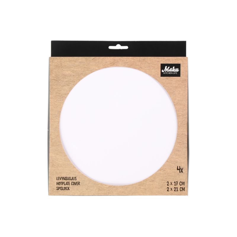 - Levynsuojus valkoinen 4 kpl Maku. Pakkaus sisältää kaksi kappaletta noin 16 senttimetrin ja kaksi 20 senttimetrin halkaisijaltaan olevaa valkoista suojaa keittolevyille. Levynsuojuksia käytetään keittolevyjen peittämiseen ja kuumien keittoastioiden alustaksi. Levynsuojukset ovat konepesun kestäviä.