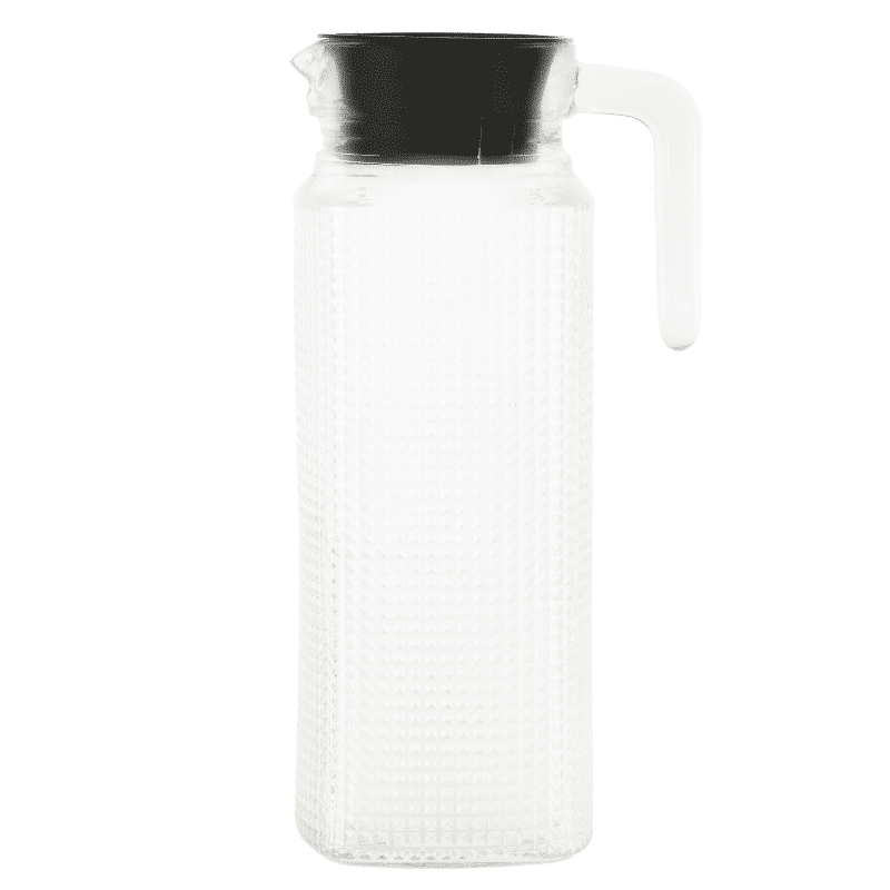 Lasinen hyvin jääkaapin oveen mahtuva mehu- tai vesikannu, jonka vetoisuus on yksi litra. Kannussa on röpelöinen koristeellinen pinta. Käsinpestävä.
