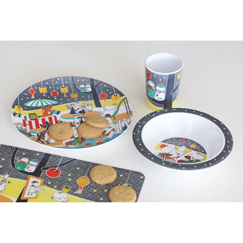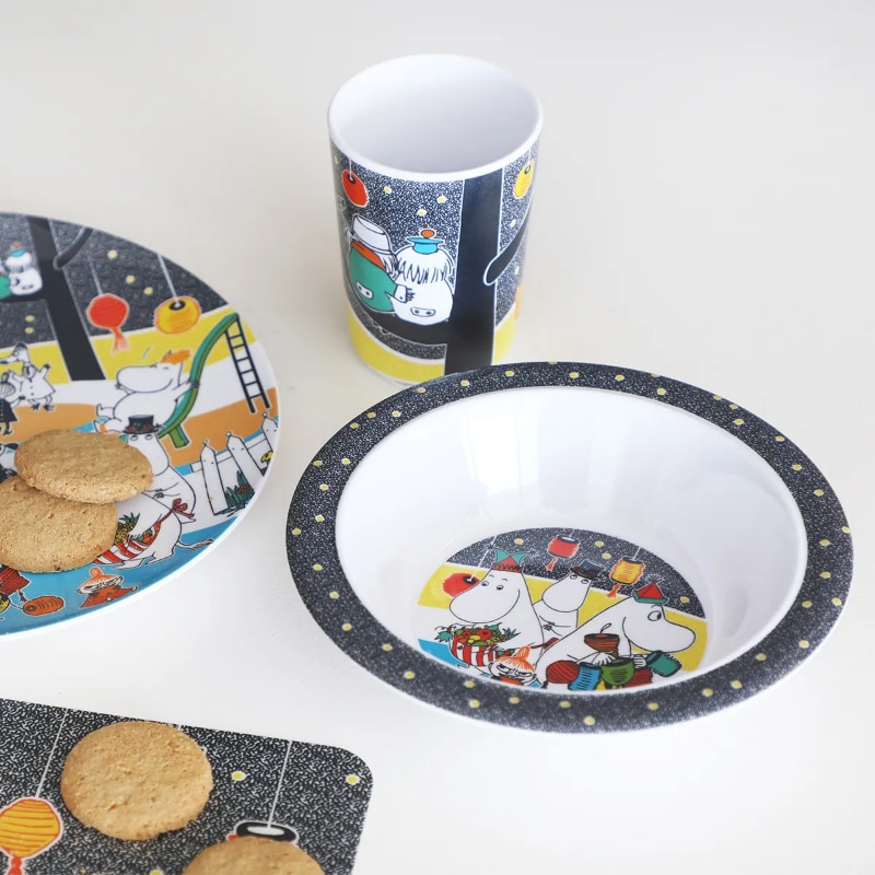 Tove Janssonin Muumit ovat ehkäpä Suomen tunnetuimpia ja rakastetuimpia satuhahmoja. Tunnelmallisen värikäs pyöreä melamiinikulhon vetoisuus on 3,5 dl ja halkaisija 16,5 cm. Kulhon reunat nousevat reilusti ylöspäin, jolloin lapsen on helppo syödä itse ja saada kulhosta ruokaa lusikkaan. Kulhon pohjan kuvassa Muumilaakson väki valmistautuu syksyiseen sadonkorjuujuhlaan. Sen saa yhdistettyä kauniisti muun Syysjuhla-sarjan tuotteisiin. Mainio lahjaidea, joka tuo iloa ruokapöydän äärelle.