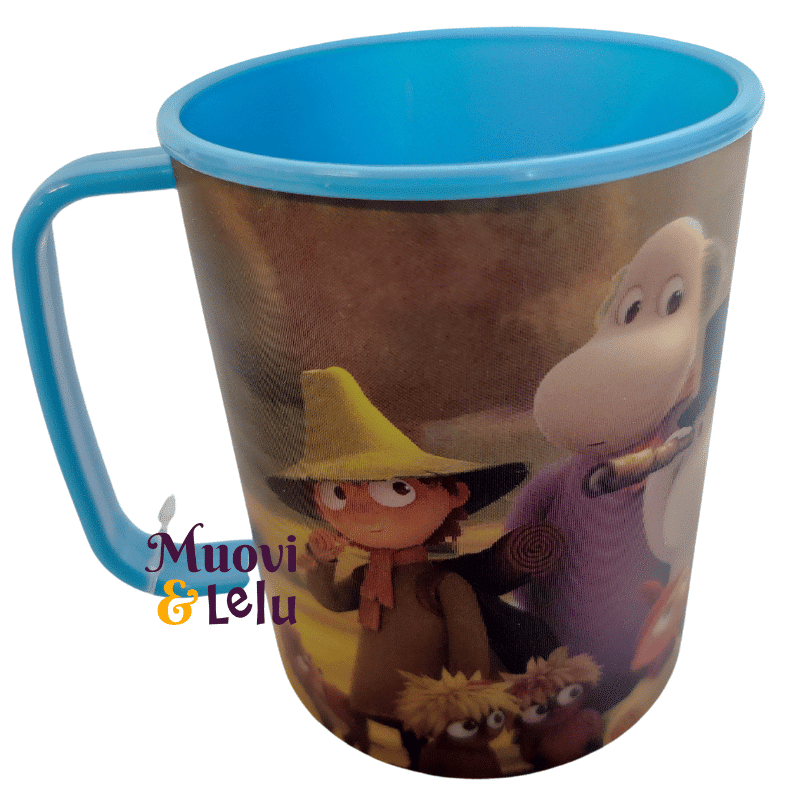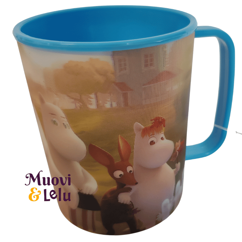Hieno kolmiulotteinen sininen juomamuki, jossa poseeraa Muumiperhe ja taustalla häämöttää Muumimaailma. Tätä mukia voivat esimerkiksi lapset käyttää arkimukina. Sopii myös erinomaisesti kaikille hammasmukiksi. Käsinpestävä. Pese huolella ennen käyttöä. Ei saa pestä astianpesukoneessa tai laittaa mikroaaltouuniin.