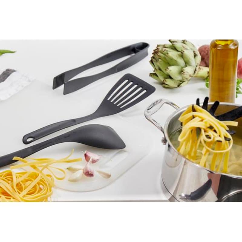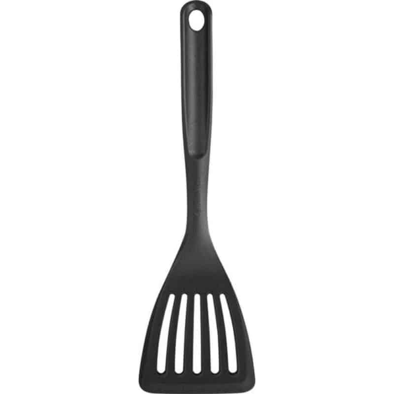 - Lastan viistoreunainen pää helpottaa paistosten kääntämistä pannussa.