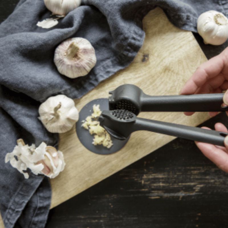 Murskaa valkosipulinkynnet nopeasti ja siististi. Helppo puristaa kynnet myös kuorineen, kuori jää puristimeen. Toisistaan irrotettavat kahvat ja puhdistuspiikit helpottavat valkosipulipuristimen puhdistamista.