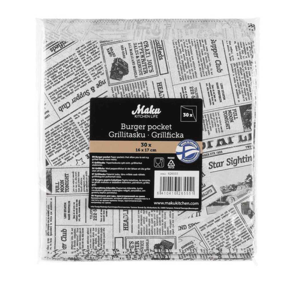 - Paperinen grillitasku hampurilaisille, makkaroille ja muille grilliherkuille. Paperitaskusta syöt esim. grilliherkut siistimmin. Taskun koko: 16 x 17 cm.