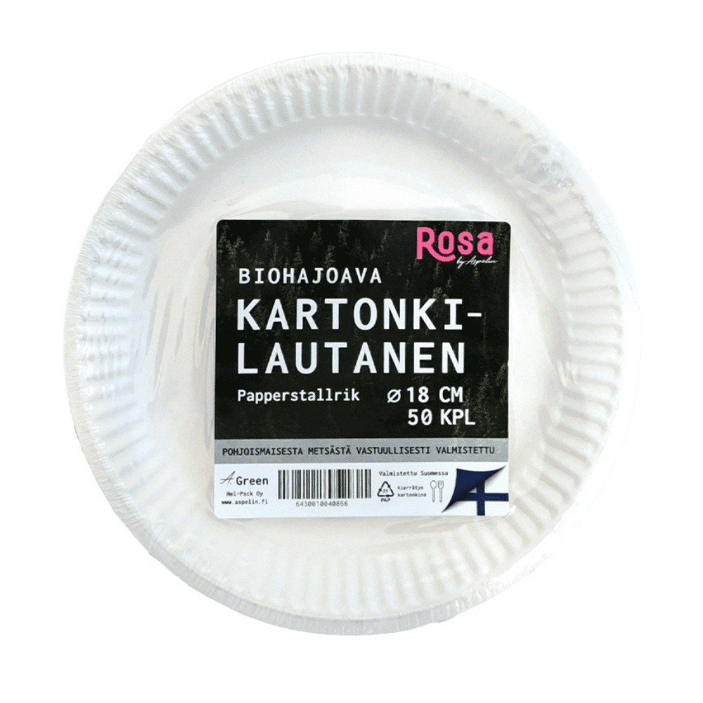 - Kertakäyttölautanen matala 18 cm 50 kpl biohajoava Rosa on valmistettu vastuullisesti suomalaisesta metsästä. Halkaisija: 18 cm. Määrä: 50 kpl.