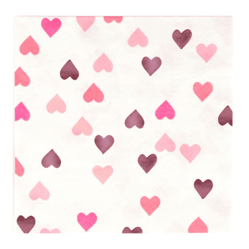 16 kappaleen pakkaus paperilautasliinoja punaisilla sydämillä. Yhden lautasliinan koko taiteltuna noin 16,5 cm x 16,5 cm.