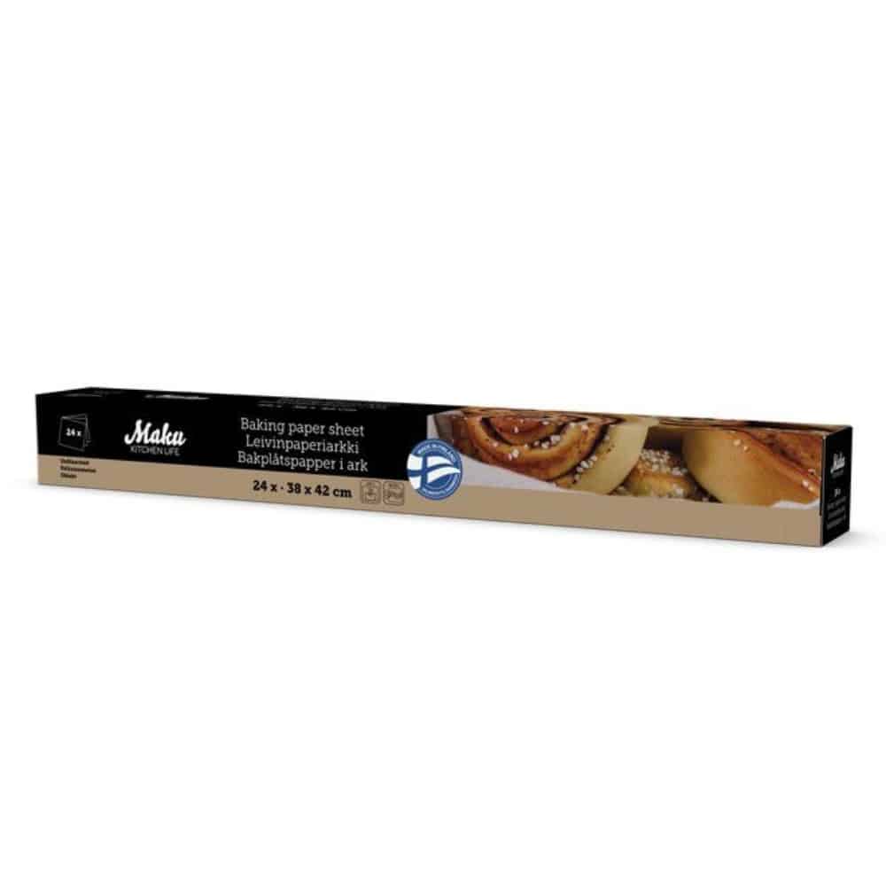 - Leivinpaperi arkki Maku 24 kpl – Maku valkaisematon leivinpaperi leivontaan ja ruoanlaittoon. Tuote on silikonisoitua paperia ja valmiiksi leikattu. Tuotetta voi leikata pienemmäksi.
