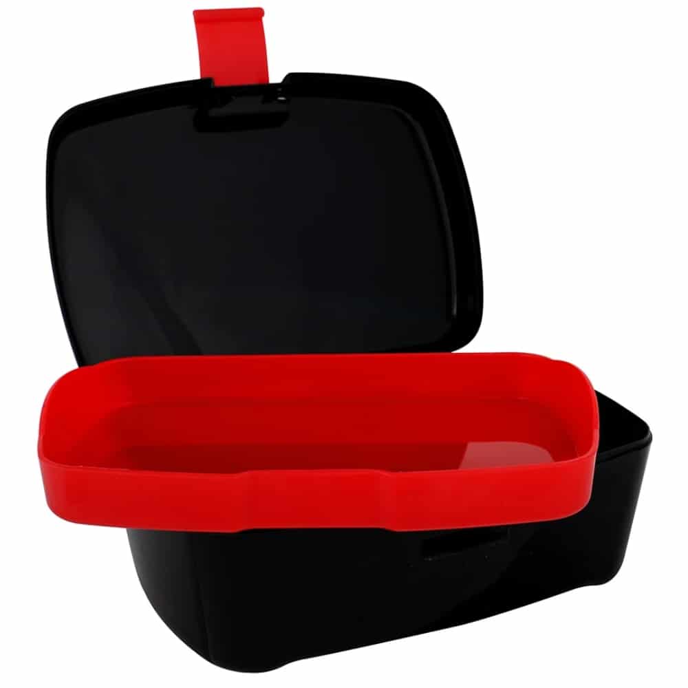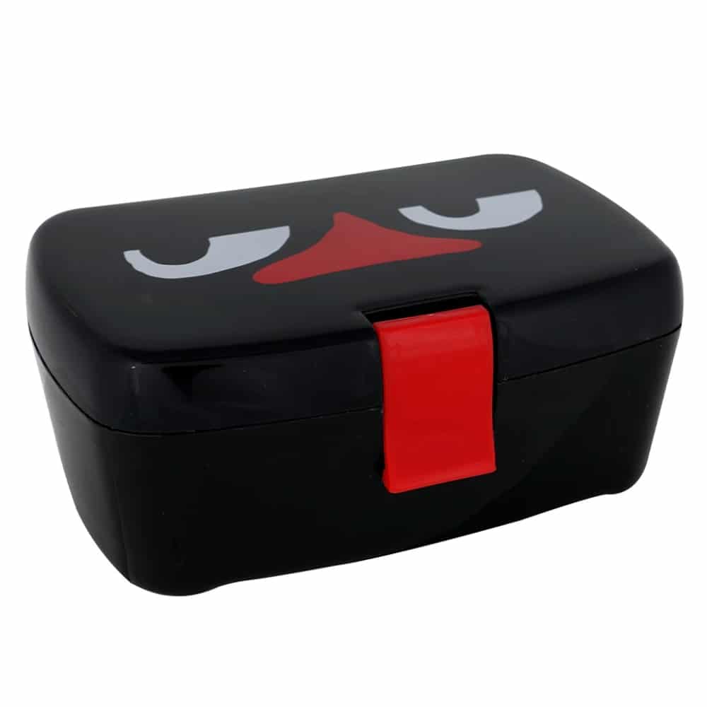 Tyylikkään musta, veikeä ja kätevä Haisuli-eväsrasia, jossa on saranakansi ja helposti avattava lukko. Rasia on suorakaiteen muotoinen: sen leveys on 16 cm ja korkeus on 11 cm. Rasian sisällä on irrotettava yläosa, jonka avulla eväitä voi pakata kahteen kerrokseen, mutta sitä voi käyttää myös yksilokeroisena.