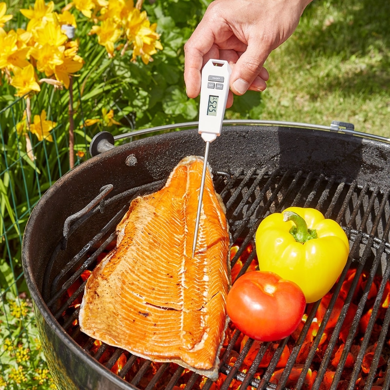 Tämä on monikäyttöinen lämpömittari kodin lämpötilamittauksiin. Voit helposti tarkistaa lämpötilan vaikkapa kalaa grillatessa tai savustaessa, pullaa leipoessa tai suklaata temperoidessa. Mittarissa on ON/OFF-kytkin ja automaattinen virrankatkaisu 10 minuutin jälkeen. HOLD-toiminnolla voit lukea lämpötilan, vaikka et juuri mittaushetkellä näyttöä näkisi. Pitkässä anturissa (14 cm) on ohut kärki, joka nopeuttaa mittaamista.
