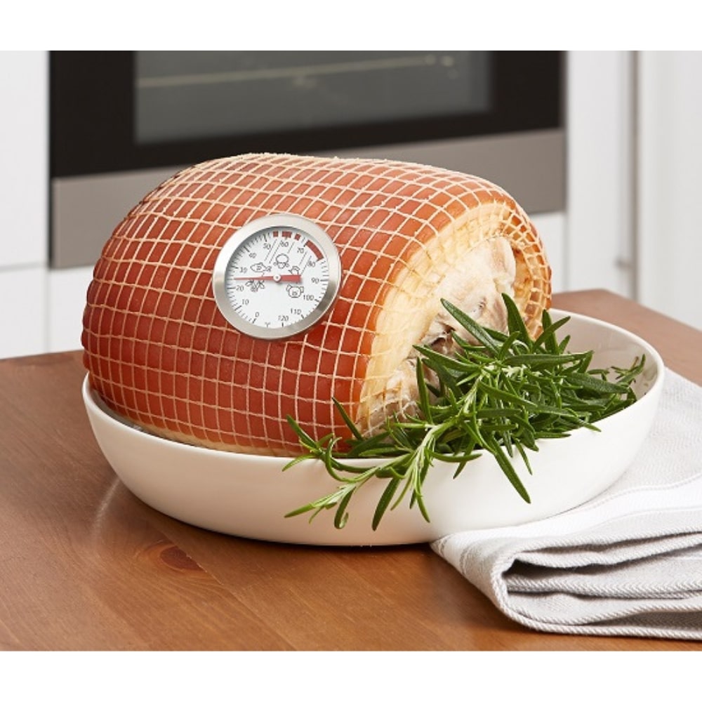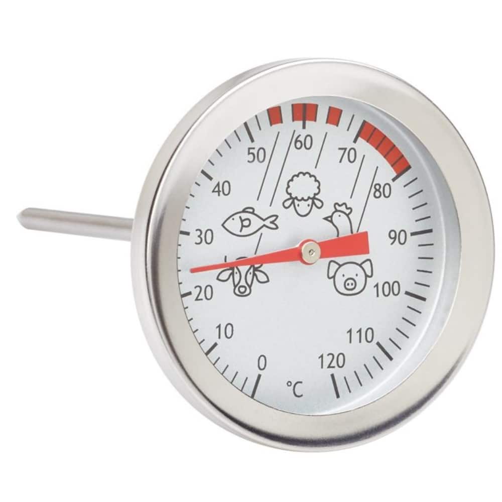 Pyöreä paistilämpömittari on valmistettu ruostumattomasta teräksestä. Mittariin on painettu ohjeelliset paistolämpötilat eri lihalaaduille. Aseta mittari paistoksen keskelle niin, että se ei koske luuhun.