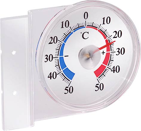 Pyöreä ulkolämpömittari jonka voi kiinnittää joko ikkunalasiin tarralla tai ikkunanpuitteeseen ruuveilla.