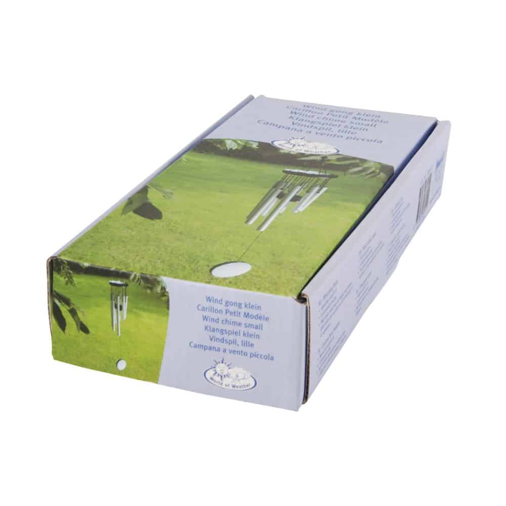 Small round wind chime with 8 aluminum tubes. Packed in a gift box.
