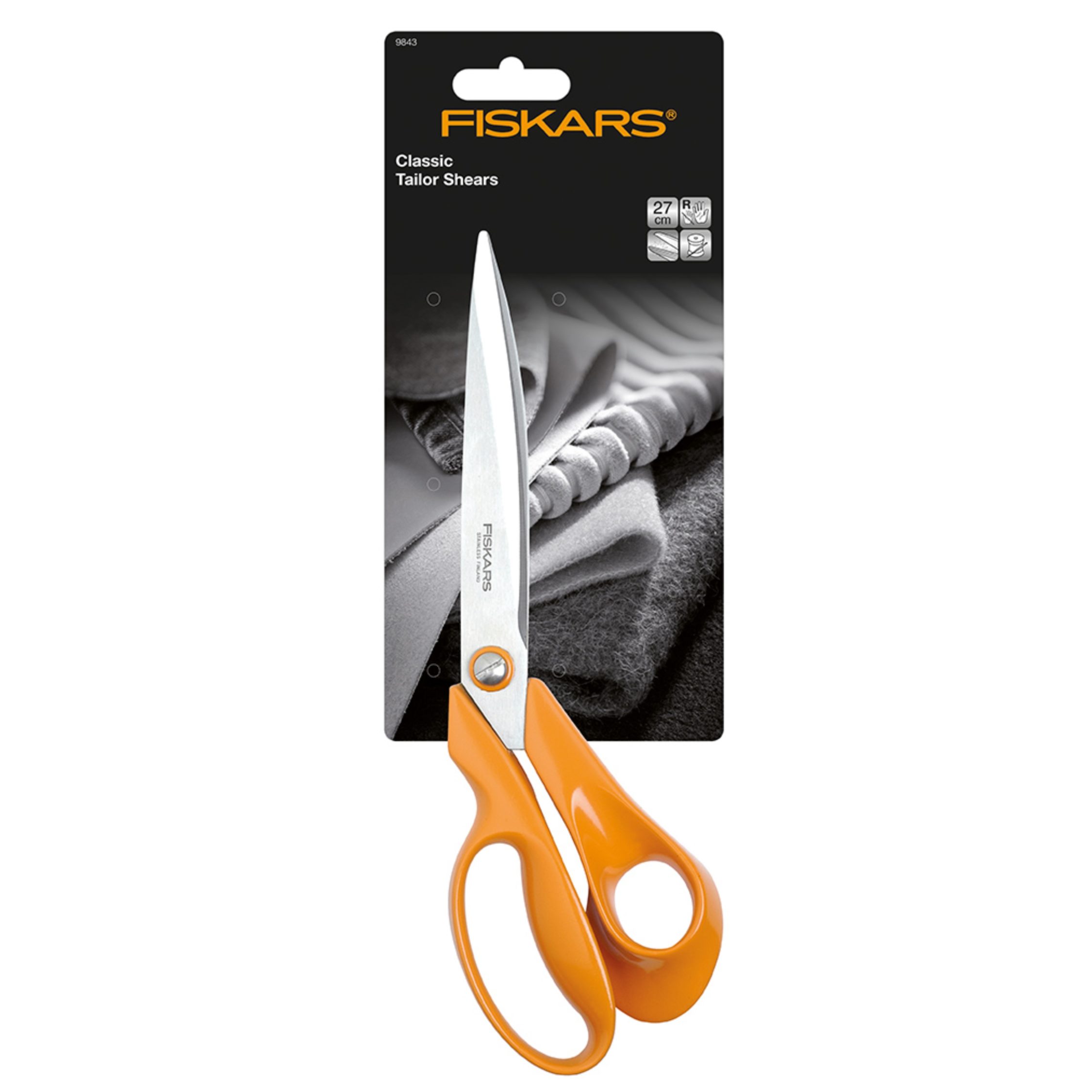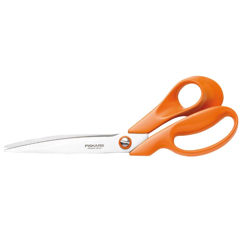 Fiskars Classic räätälinsakset. Pitkät terät helpottavat leikkaamista. Terät ruostumatonta terästä. Konepesun kestävät.