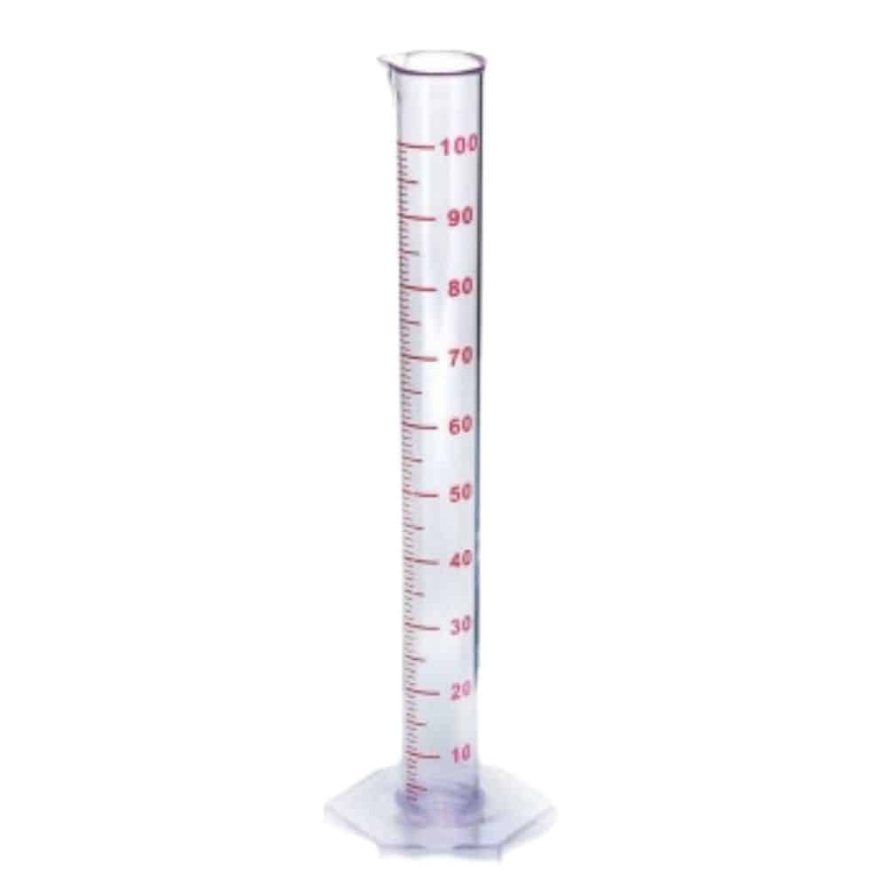Mittalasi 100 ml muovia. Muovinen mittalasi jalalla. Kapasiteetti: 100 ml. Asteikko: 1 ml välein