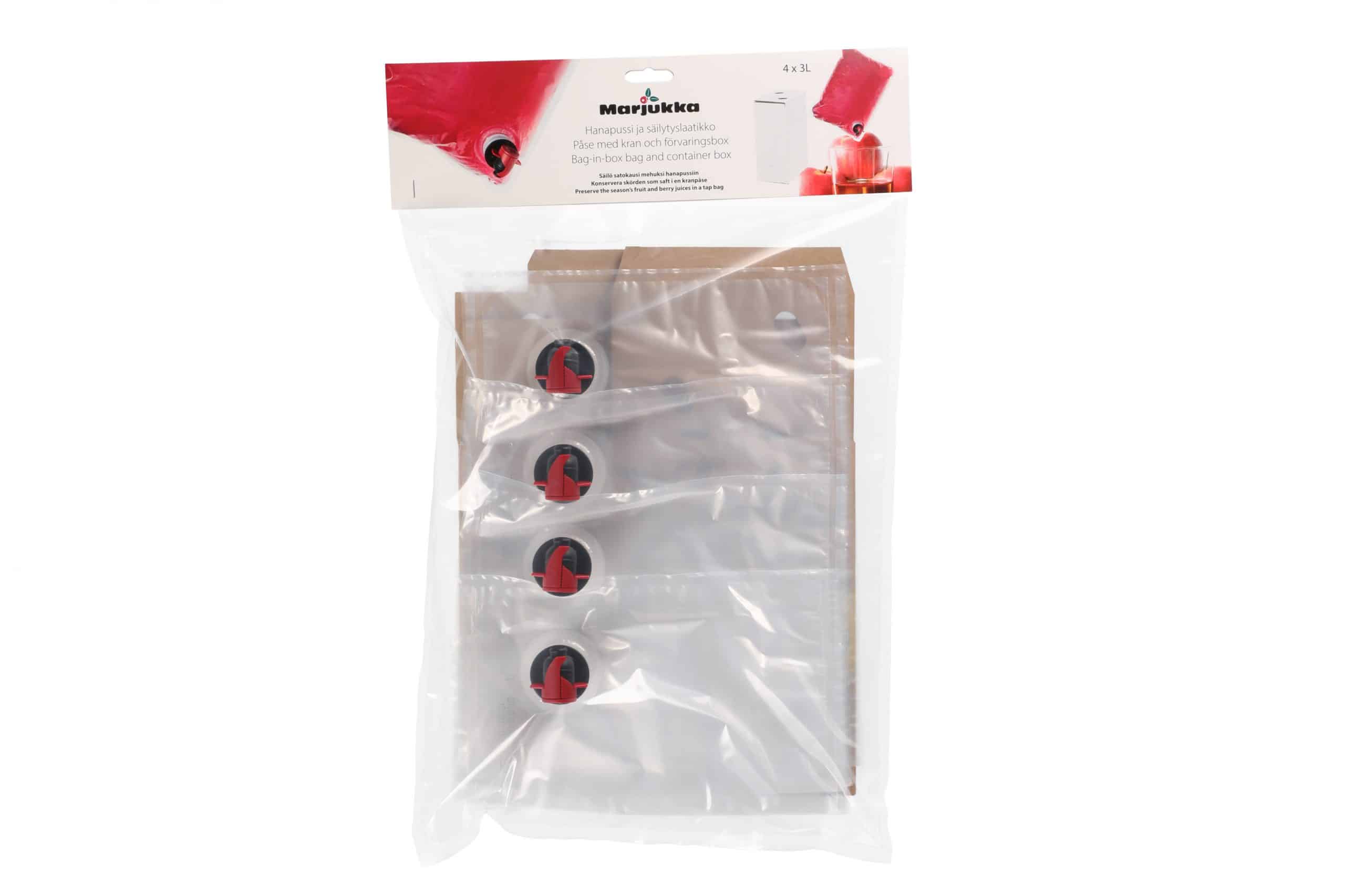Hanapakkaussetti sisältää laatikon ja 4 kpl kolmen litran (yht. 12 litraa) hanapusseja.