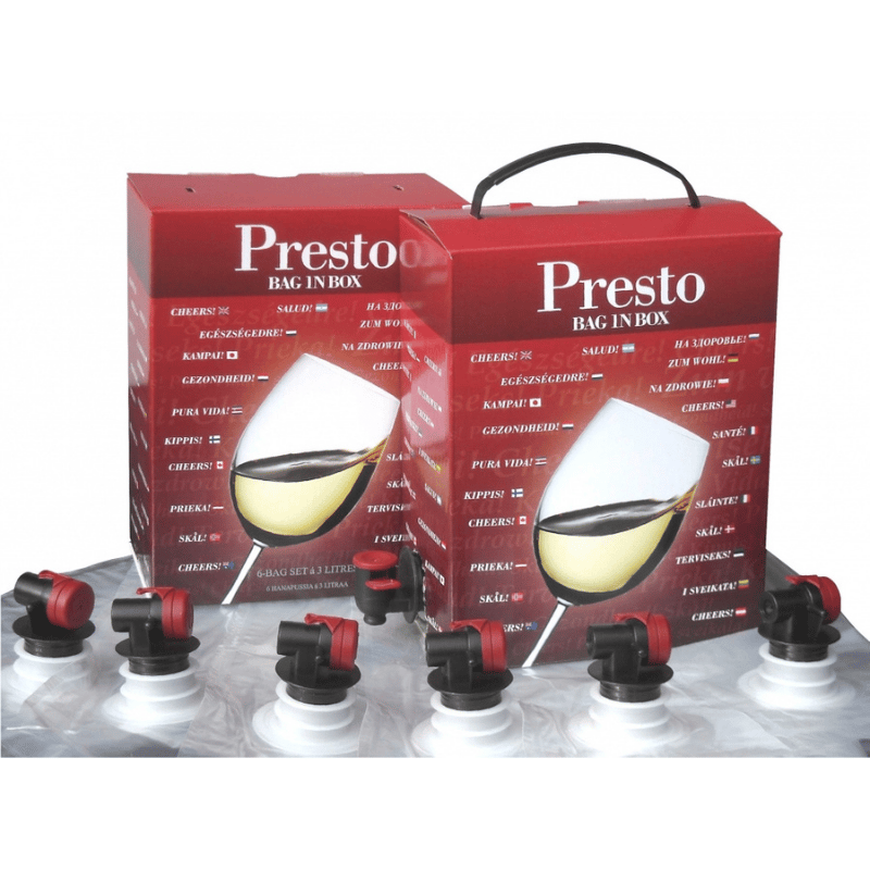 Presto Bag in Box – hanapakkaussetti sisältää yhden laatikon ja 6 kpl kolmen litran (yht. 18 litraa) vetoista steriilisti (aseptisesti) suljettua hanapussia sekä sangan.