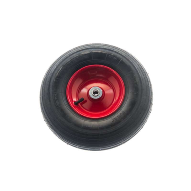 13″ 3,50/3,50-6″. Ilmatäytteinen kottikärryn vararengas teräsvanteella. 25 mm reikä akselille, pienennysholkit 20 mm, 16 mm ja 14 mm. Keskiön pituus 77 mm.