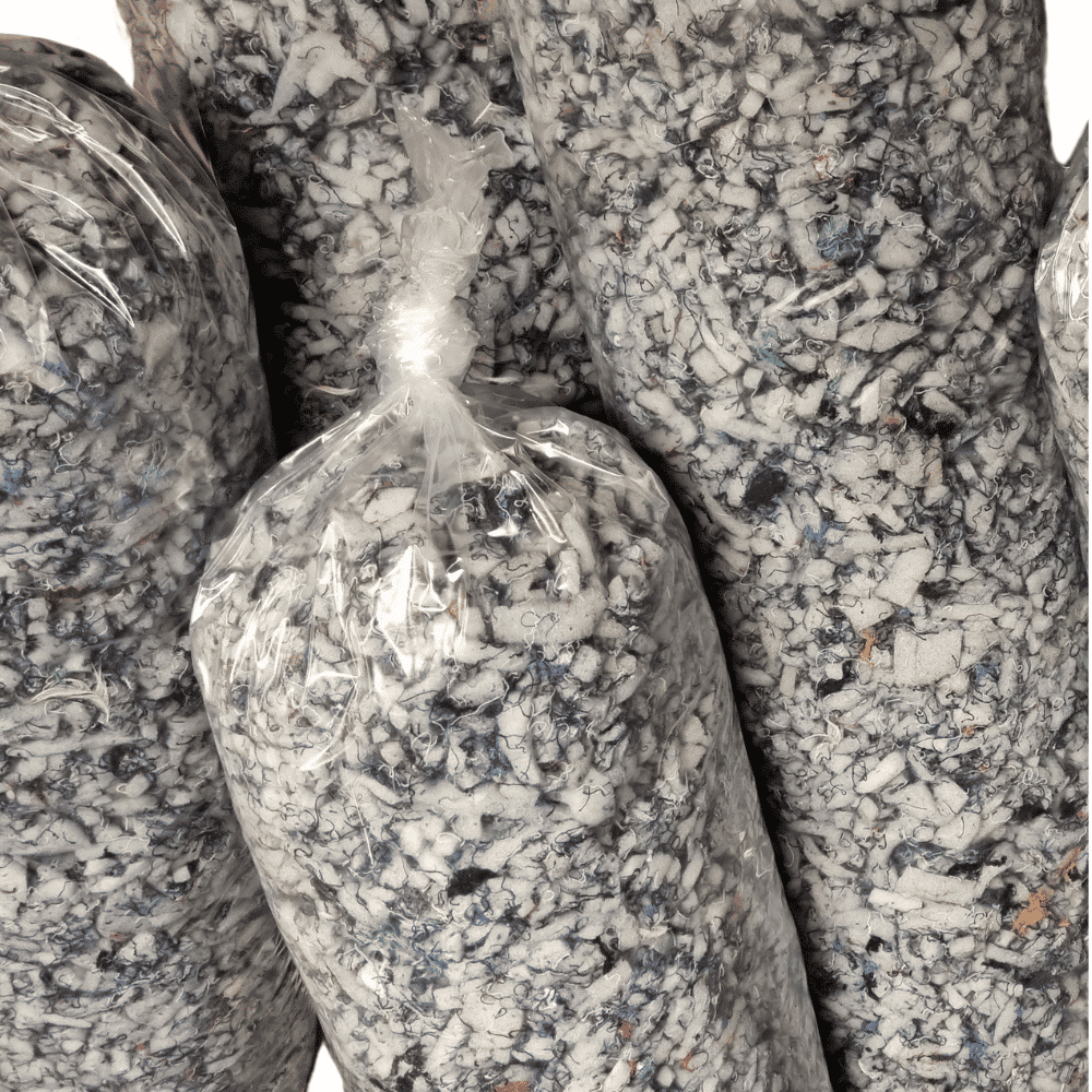 Vaahtomuovirouhe Flockfoam 1 kg sisältää 30 % vaahtomuovilastua ja 70 % poistotekstiilikuitua. Uusi ekologinen täyte! Tekstiilikuitu tekee vaahtomuovista vähemmän sähköistä, joten rouhetta on helpompi käsitellä. Tekstiilikuitu tekee rouheen koostumuksesta tiiviimpää eli se pysyy paremmin kuosissa, muhkeana. Tekstiilikuidun väri vaihtelee riippuen mistä poistotekstiilistä sitä on rouhittu.