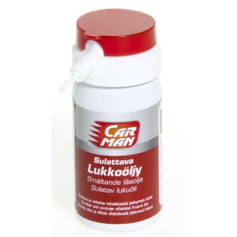 Uudelleen jäätymistä ehkäivevä lukkoöljy jäätyneiden lukkojen sulattamiseen sekä lukkopesän voiteluun. Sulattava lukkoöljy helpottaa lukkojen, kuten auton oven lukon tai pyörälukon avaamista talvikausina. Kovilla pakkasilla lukot jäätyvät herkästi, jolloin kaivataan sulattavaa lukkoöljyä. Lukkoöljy sulattaa nopeasti jäätyneen lukon, voitelee tehokkaasti sekä ehkäisee uudelleen jäätymistä. Lukkoöljyä voidaan levittää auton lukkoihin pesun jälkeen, jolloin lukkojen jäätymistä voidaan ehkäistä. Pakkauksessa kielet: suomi / ruotsi.