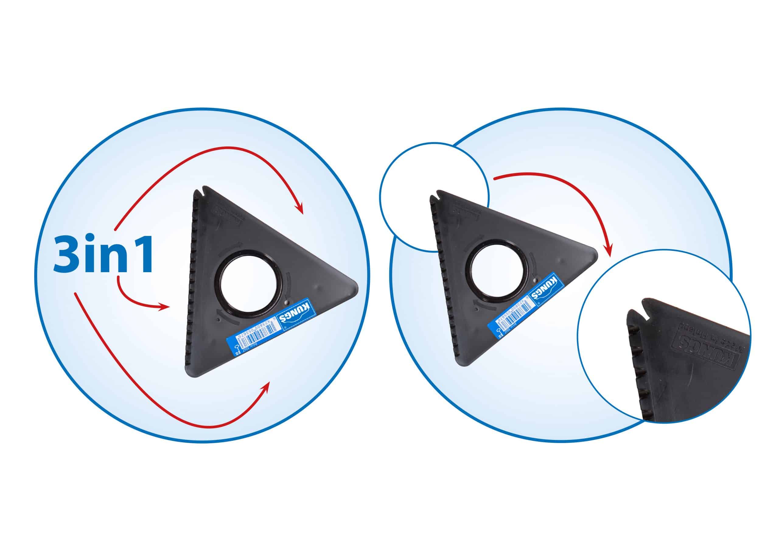 Tele-Isin vaihdettava jääraappa on myös käännettävä. Jääraapassa on yhteensä kuusi raaputuspintaa, kaksi joka reunalla.